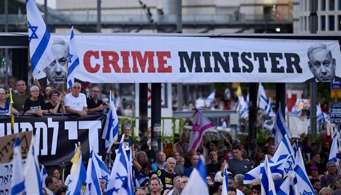 TEL AVIV: Thousands of people took to the streets in the Israeli capital of Tel Aviv on Saturday night against Prime Minister Benjamin Netanyahu calling for his resignation and an immediate ceasefire in Gaza.